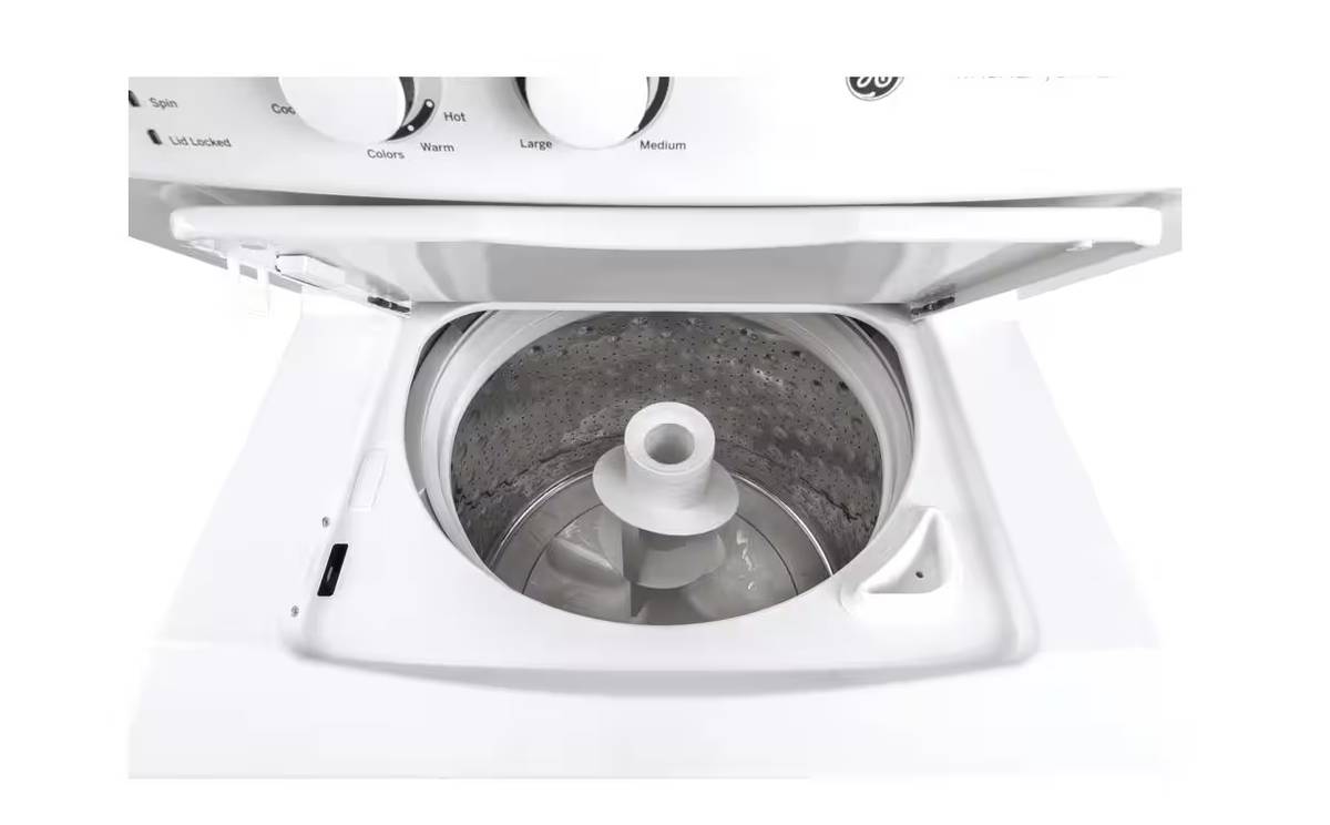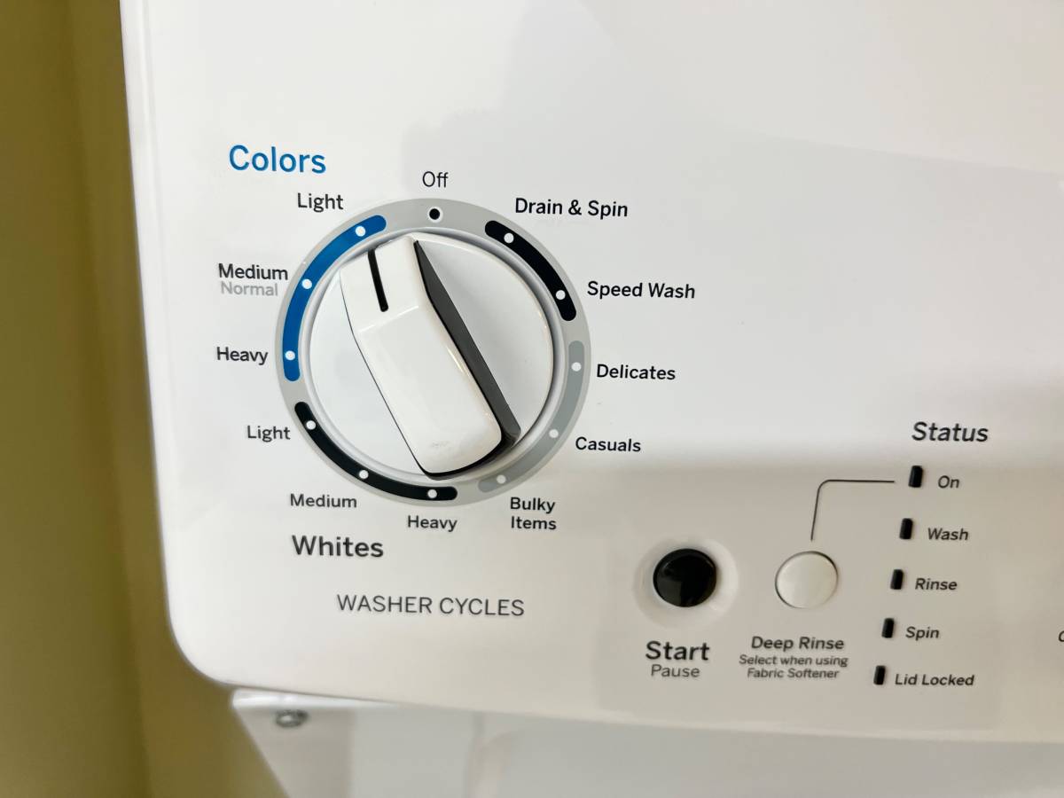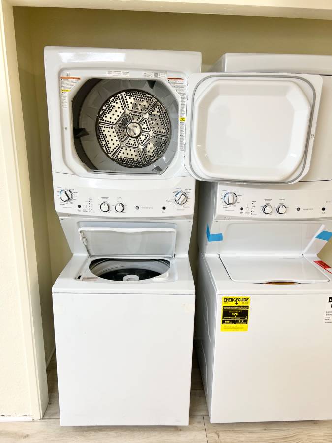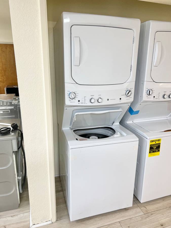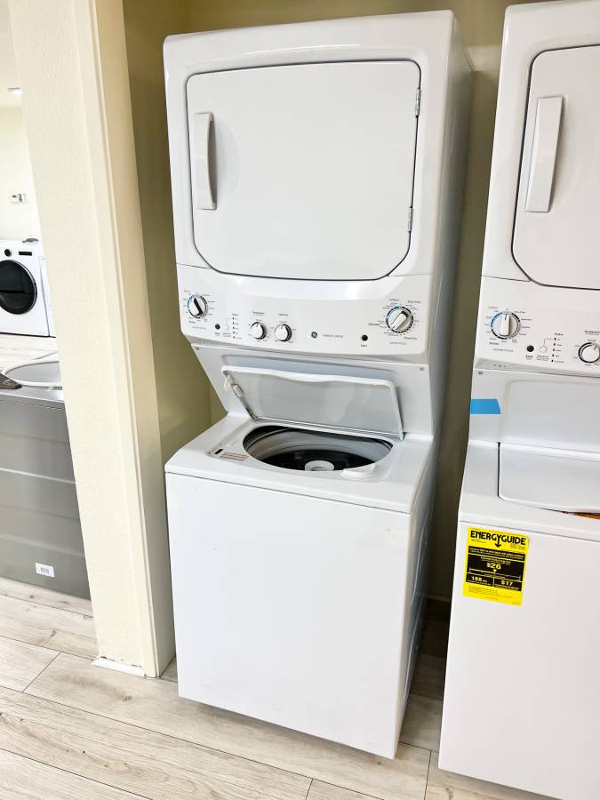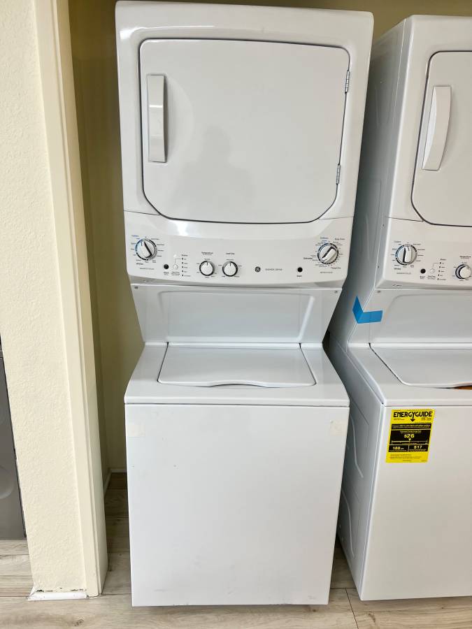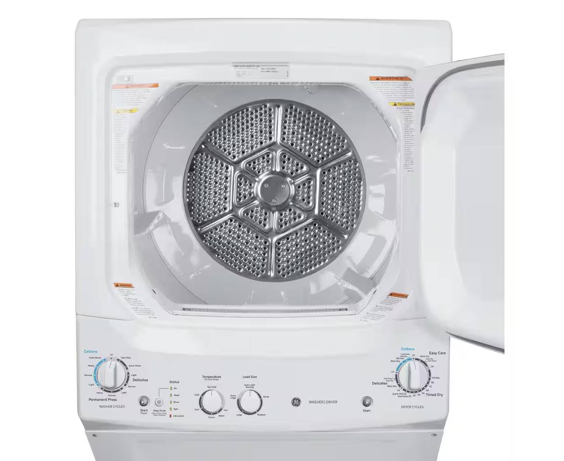27 INCH GE Stackable GUD27ESSMWW Electric Laundry Center White * New Open Box Auto-load Sensing, Cycle Status Lights, Rotary Controls, 11 Wash Cycles, 6 Wash Rinse Temperatures , 800 RPM , White .