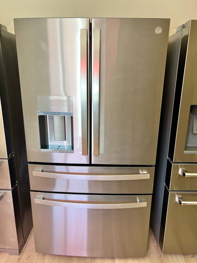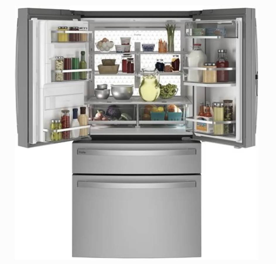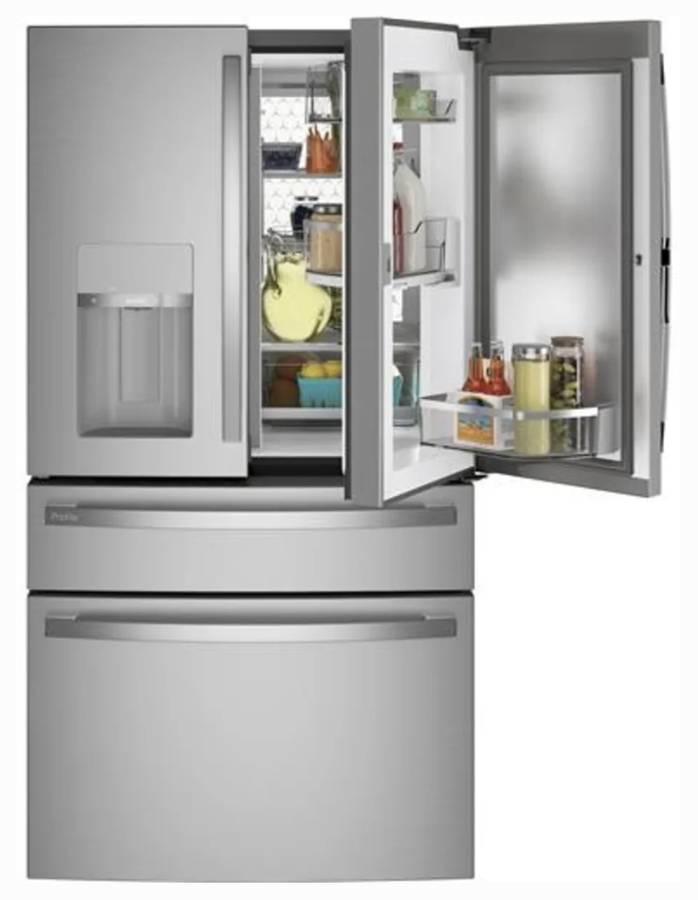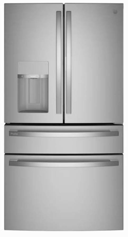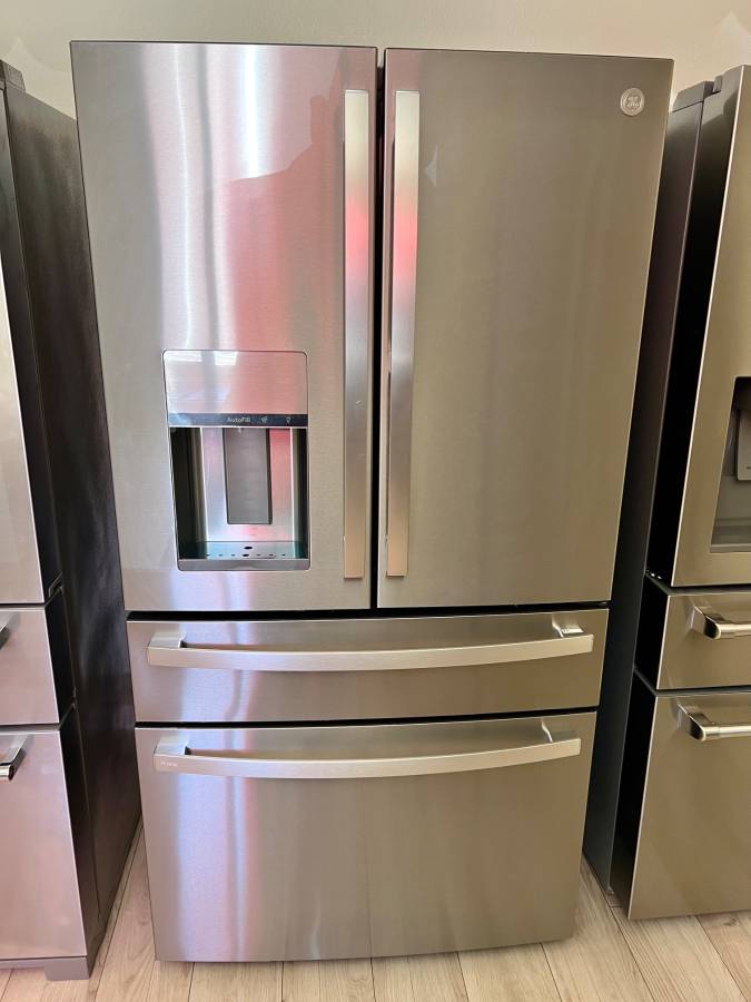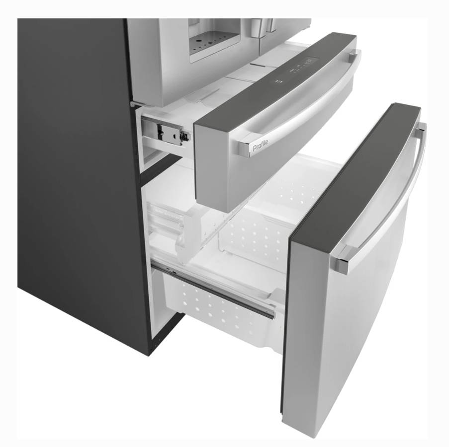 36 INCH GE PROFILE PVD28BYNGFS 4 Door French Door Smart Refrigerator , 27.9 CU Ft , Door in Door , Adjustable Temperature Drawer , LED Light Wall , Wi-Fi , Water and Ice Dispenser , Energy Star * New Open Box * , Stainless Steel .