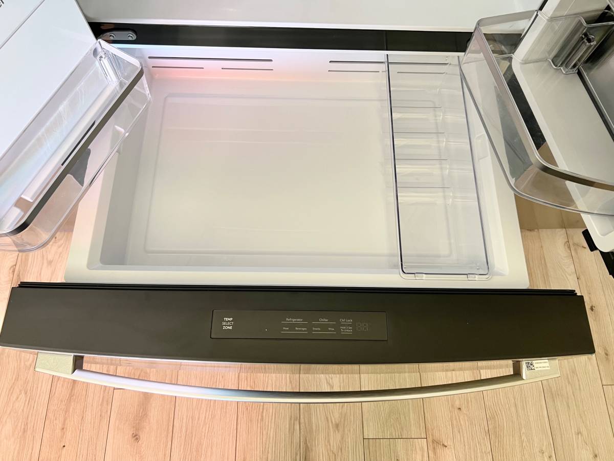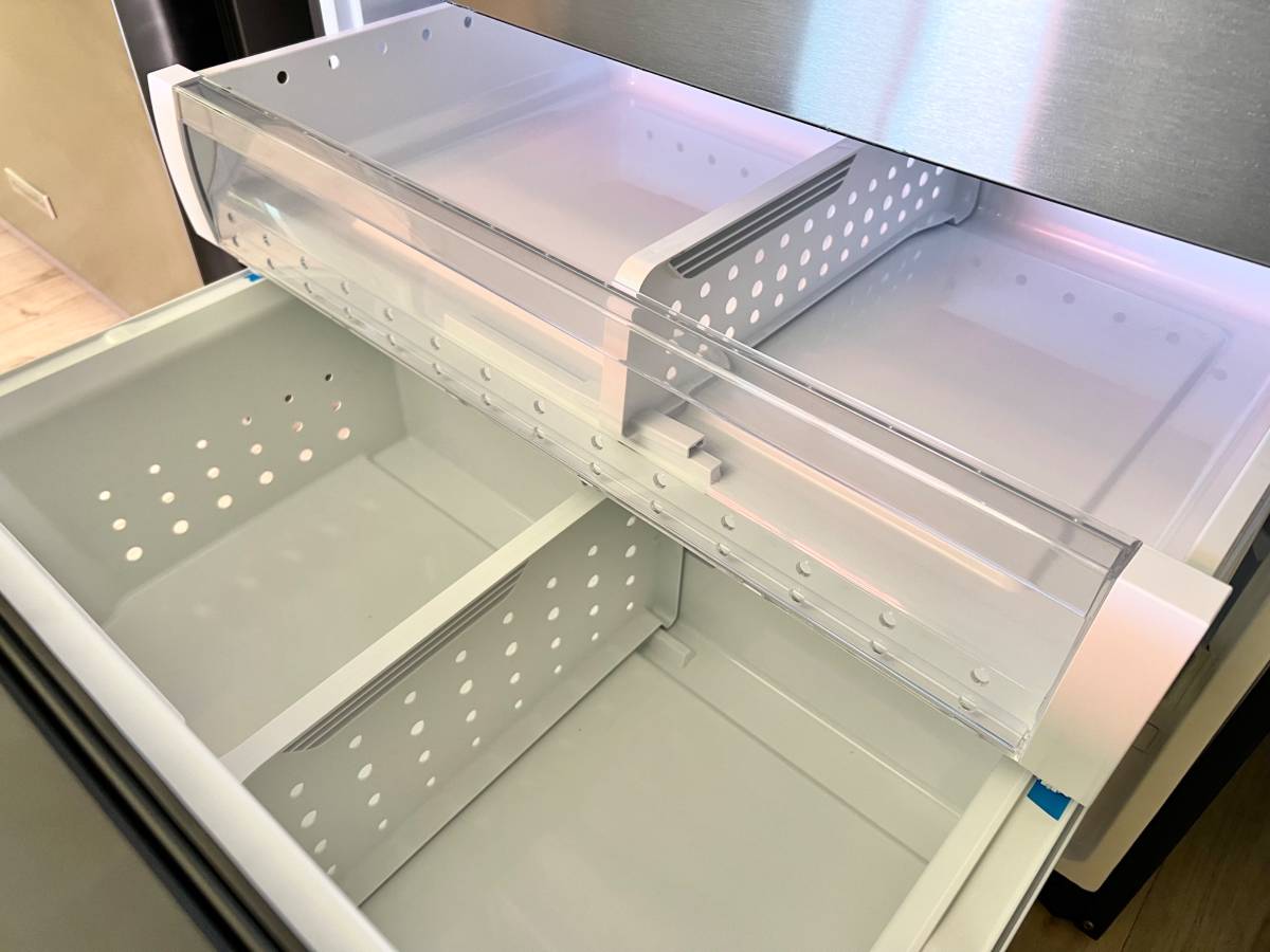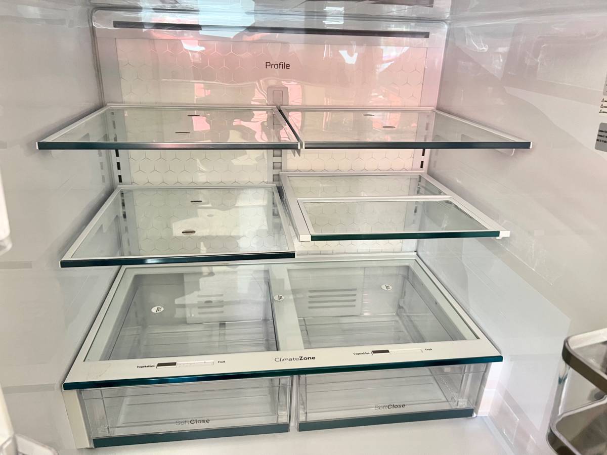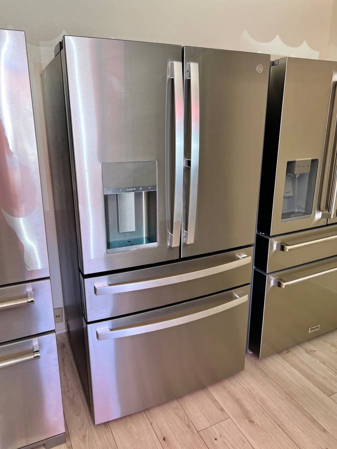 36 INCH GE PROFILE PVD28BYNGFS 4 Door French Door Smart Refrigerator , 27.9 CU Ft , Door in Door , Adjustable Temperature Drawer , LED Light Wall , Wi-Fi , Water and Ice Dispenser , Energy Star * New Open Box * , Stainless Steel .