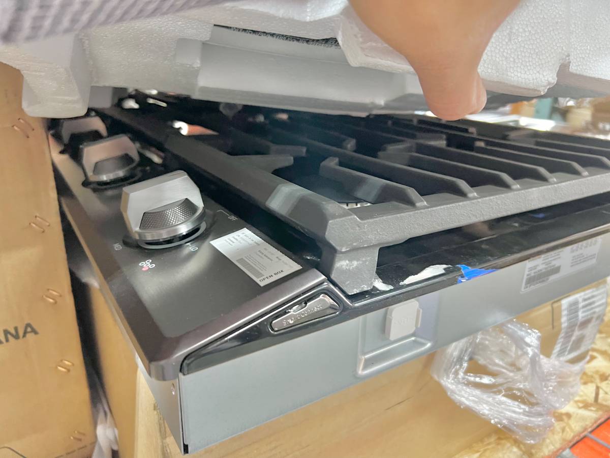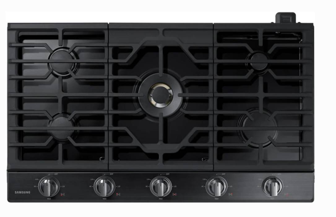 36 INCH SAMSUNG NA36N7755TG Gas Cooktop 5 Sealed Burners Continuous Grates , 22K Btu Dual Ring Burner , Wok Grate , LED Lit Knobs , LP Conversion Kit , ADA * New Open Box * , Fingerprint Resistant Black Stainless Steel .