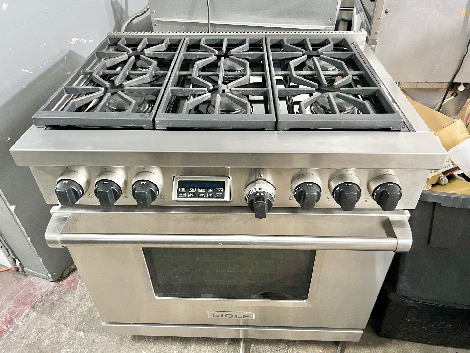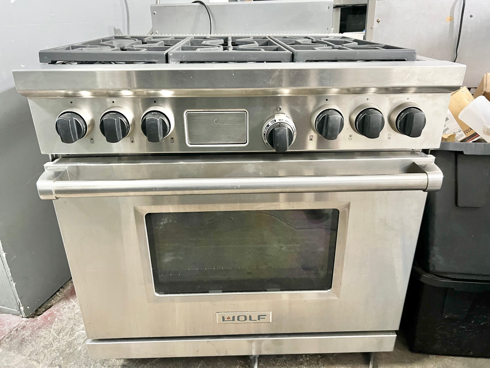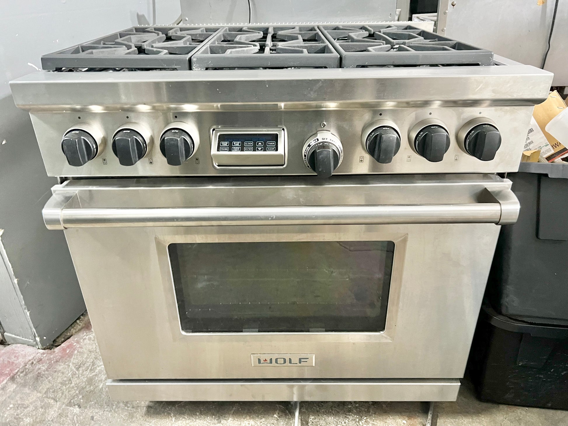 36 INCH WOLF Professional Style Dual Fuel Gas Range 5.4 cu. ft. Dual Convection Oven, 6 Dual-Stacked Sealed Burners,Temperature Probe, Continuous Grates, Natural Gas , Stainless Steel, Used Condition .