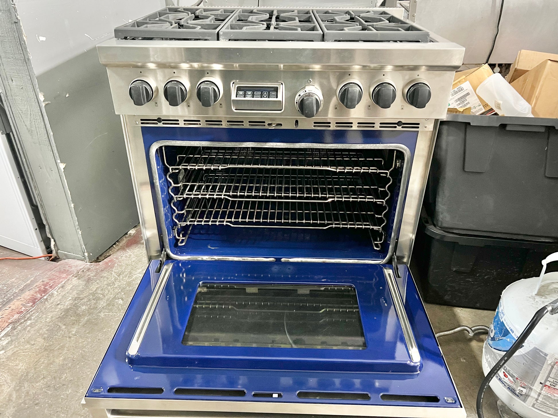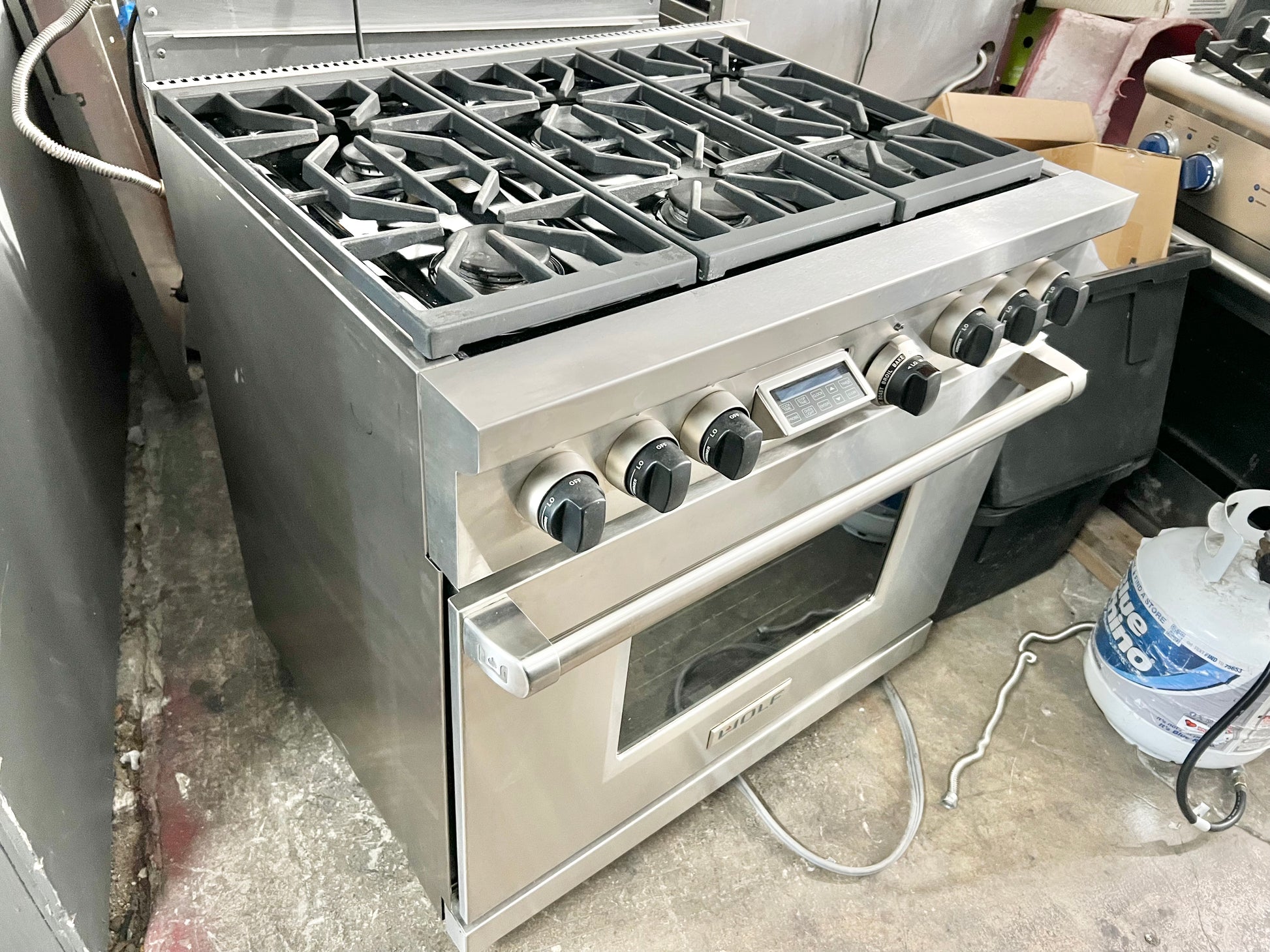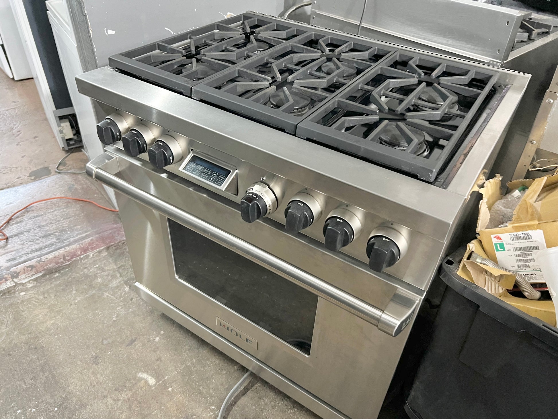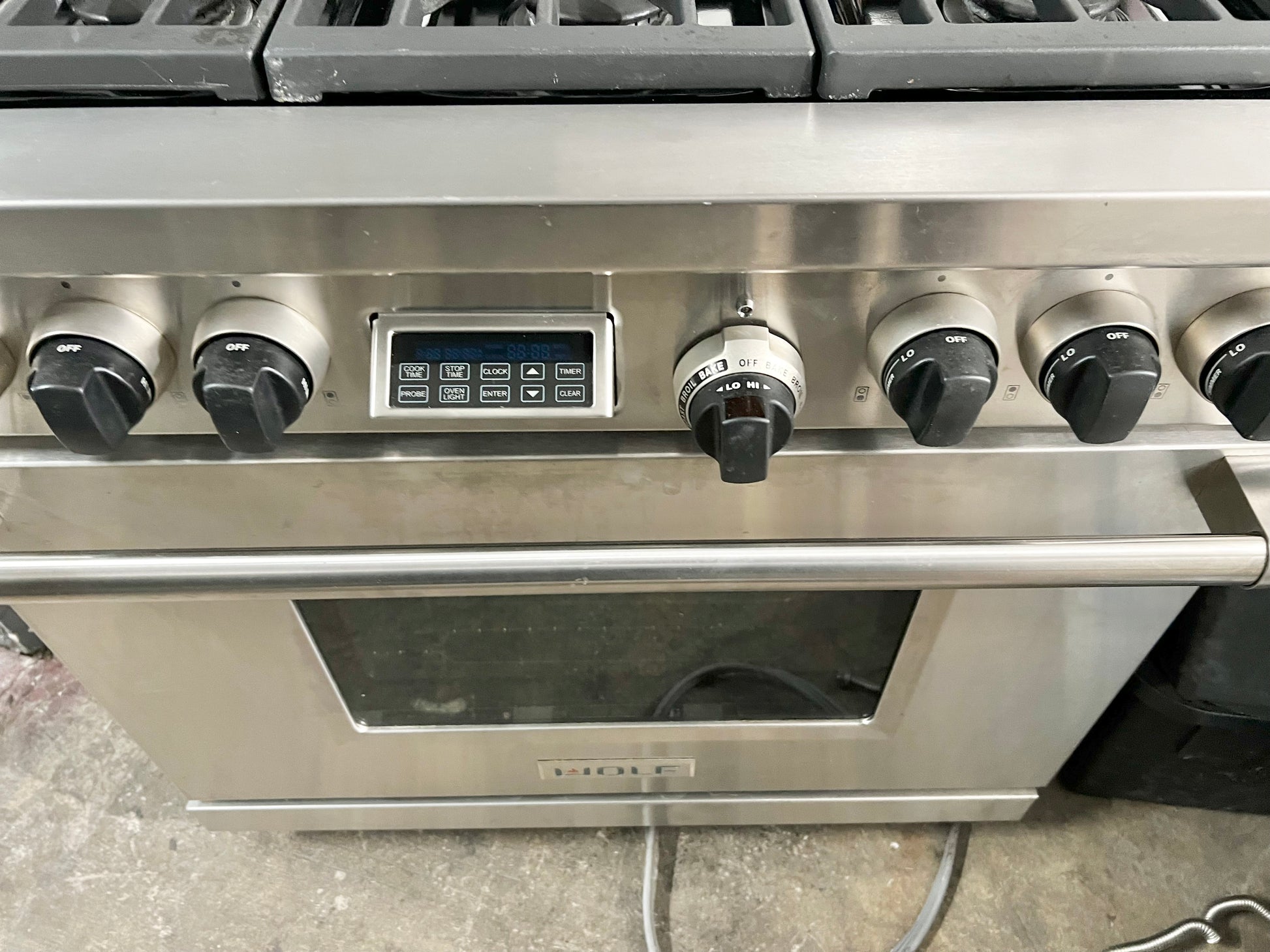 36 INCH WOLF Professional Style Dual Fuel Gas Range 5.4 cu. ft. Dual Convection Oven, 6 Dual-Stacked Sealed Burners,Temperature Probe, Continuous Grates, Natural Gas , Stainless Steel, Used Condition .